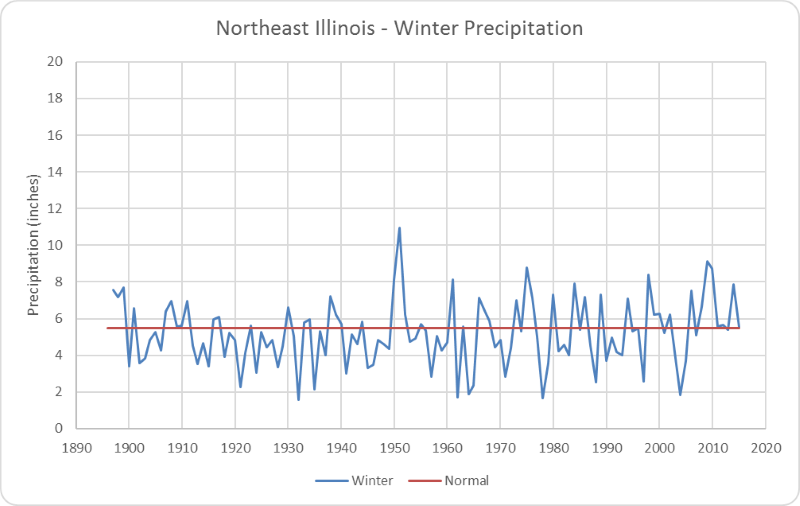 Figure 2. Northeast Illinois winter precipitation - no strong trend. The normal winter precipitation for northeast Illinois is 5.50 inches.