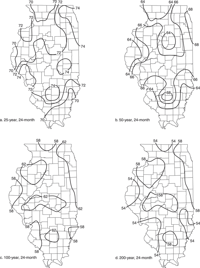 The 24-month drought at return periods or recurrence intervals of a) 25 years, b) 50 years, c) 100 years, and d) 200 years, expressed as percent of normal (1971-2000) precipitation. Source: The Water Cycle and Water Budgets in Illinois: A Framework for Drought and Water-supply Planning by Derek Winstanley et al., Illinois State Water Survey IEM 2006-02 (pdf).